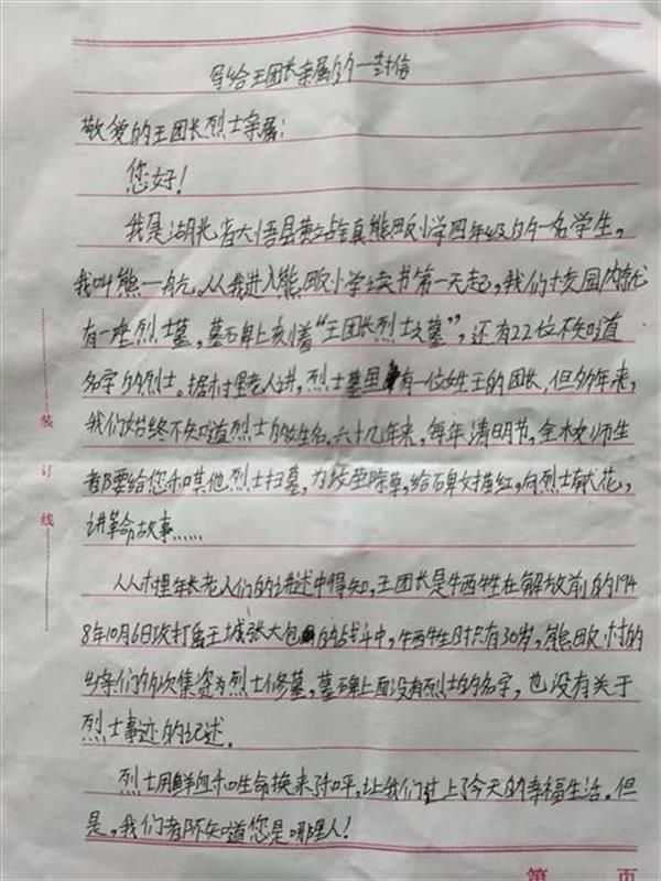 “我们湖北省大悟县黄站镇熊畈小学师生们有一个心愿:希望找到王团长和他的亲人,让英雄早点回家……”