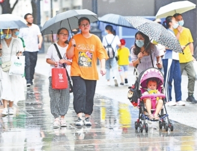 7月8日中午,在江汉路步行街上,人们在雨中逛街。雨水断断续续,时大时小。