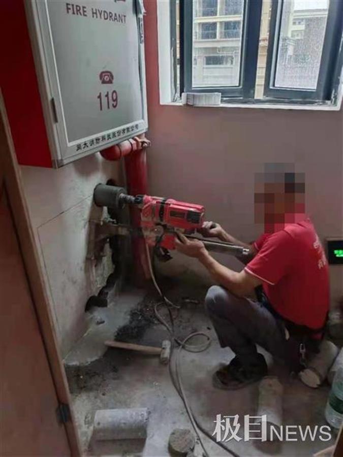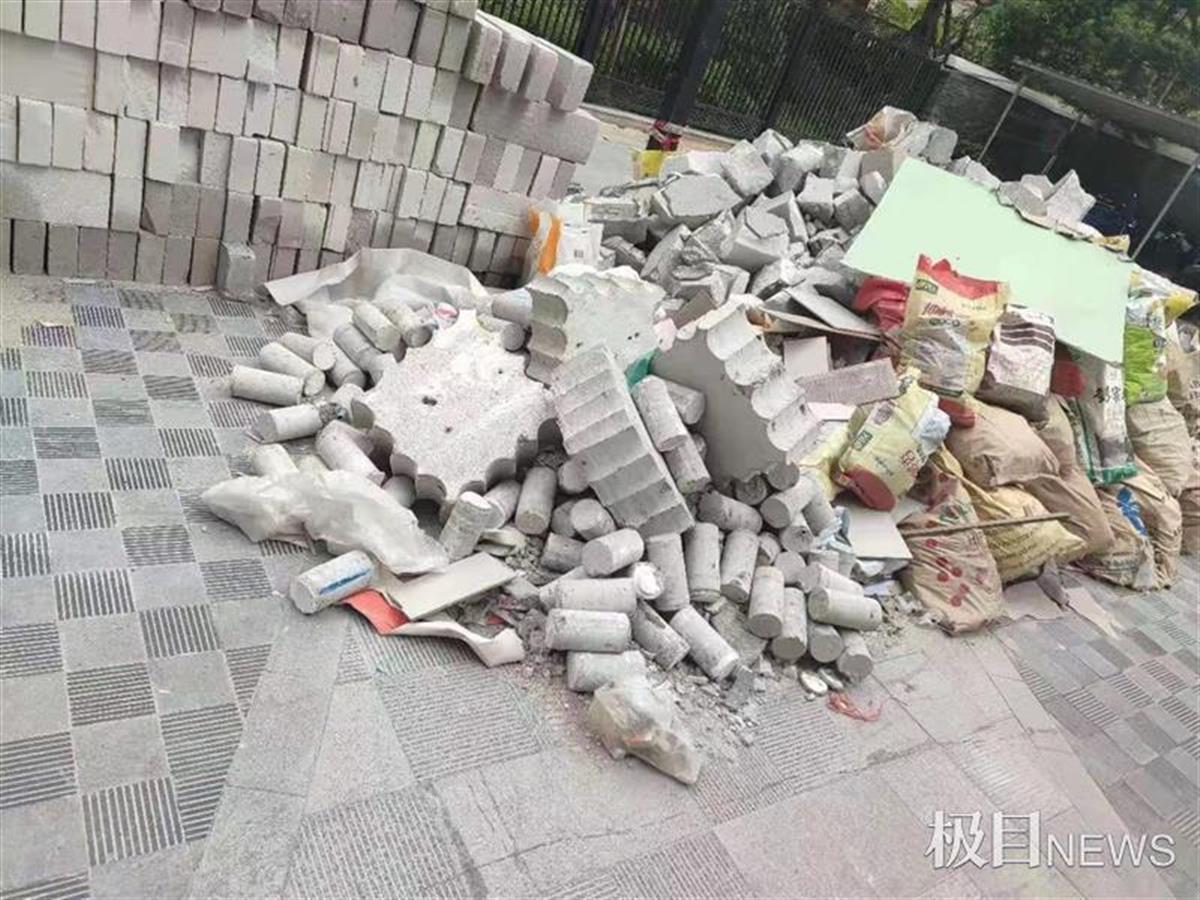 7月3日上午,有业主发现,在他们投诉后,仍有施工队来到消防通道,使用水钻在承重墙上打洞。打洞产生的大块墙体垃圾被堆放在一楼广场,现场一片狼藉。