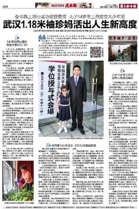 身高1.18米,今年50岁的陈幺荣是武汉江夏人。她不相信命运,一直乐观向上,不但创业成功,还收获了爱情。更让她骄傲的是,她的儿子是一名身高近1.8米的学霸,14岁被西安交通大学少年班录取,22岁从日本早稻田大学研究生毕业。