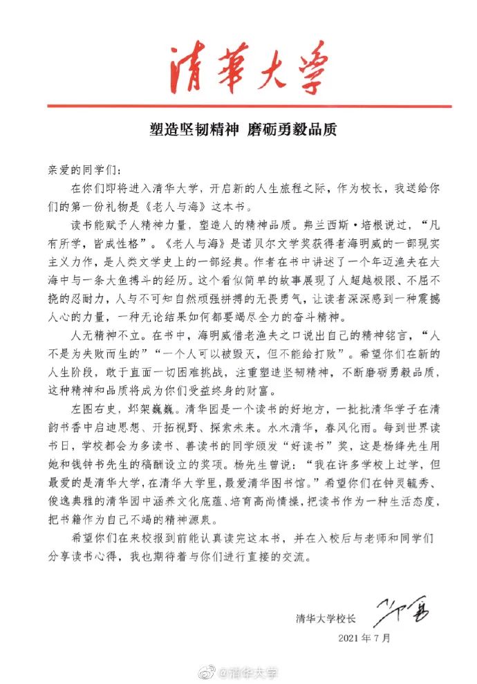“亲爱的同学们,在你们即将进入清华大学,开启新的人生旅程之际,作为校长,我送给你们的第一份礼物是《老人与海》这本书。”