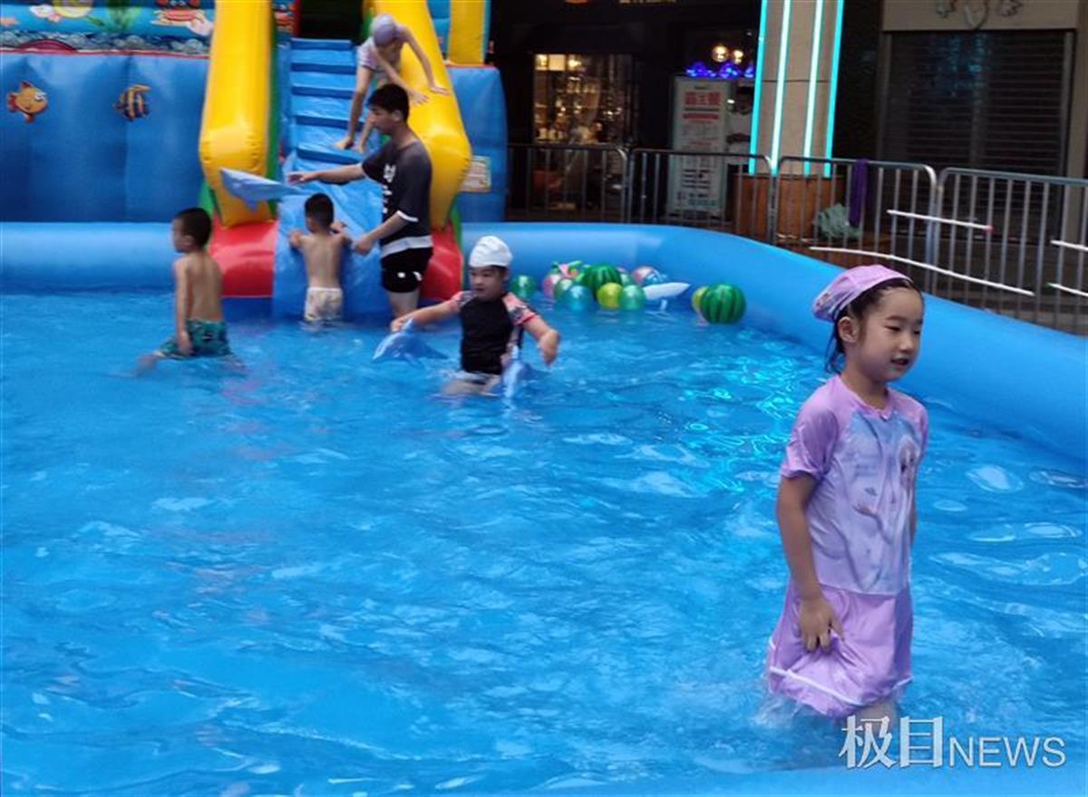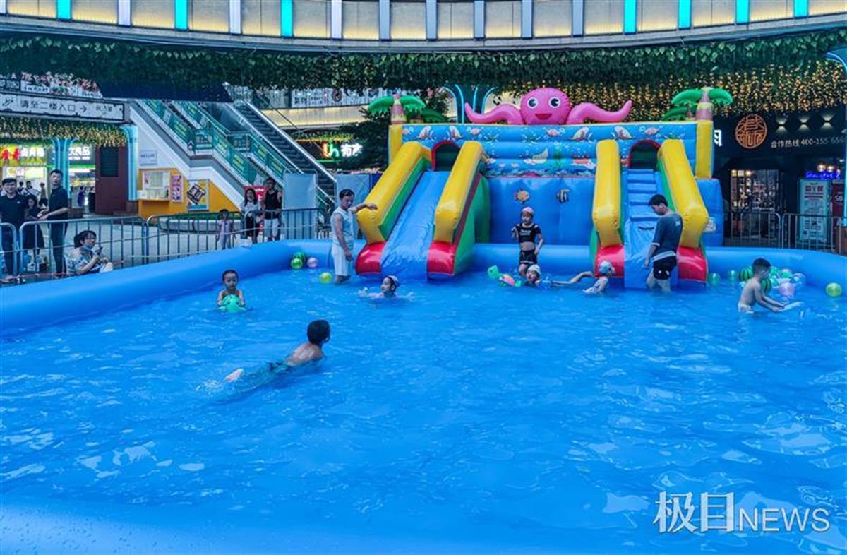 7月10日,一个占地200多个平方的充气儿童游泳池,设置在光谷熊家咀几个居民小区之间的广场上,引来不少家长带着萌娃来玩水。