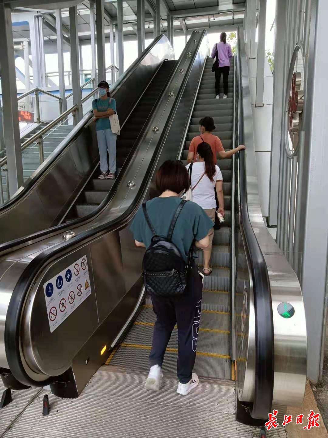 7月10日上午,长江日报记者在武汉同济医院门口看到,同济健康天桥电梯已经开通,行人可以乘坐手扶电梯上天桥过街。