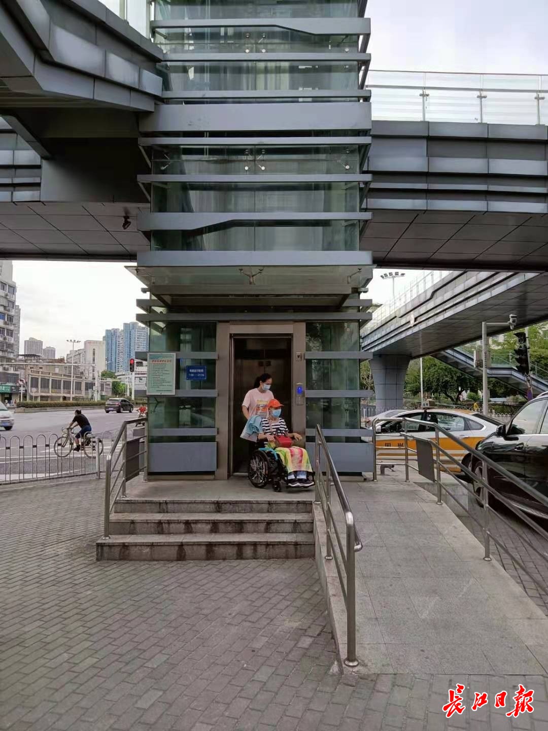江汉区马场路人行天桥,市民汪女士推着轮椅走出垂直电梯。长江日报记者李爱华 摄