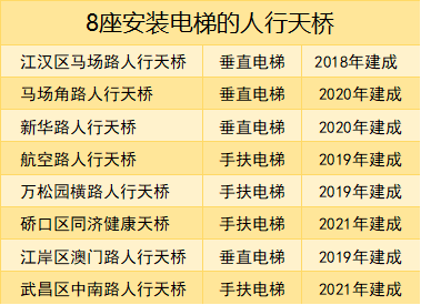 2018年7月,武汉首座拥有垂直电梯的人行天桥——江汉区马场路人行天桥投入试运行。截至目前,江汉区内共有5座天桥安装了15部电梯。