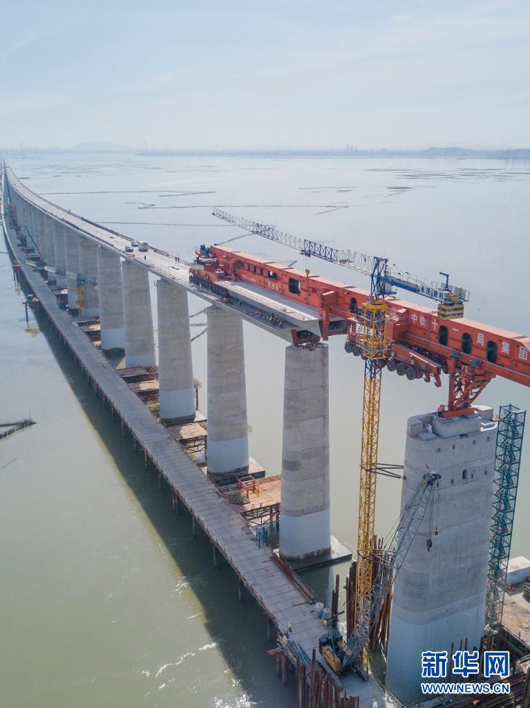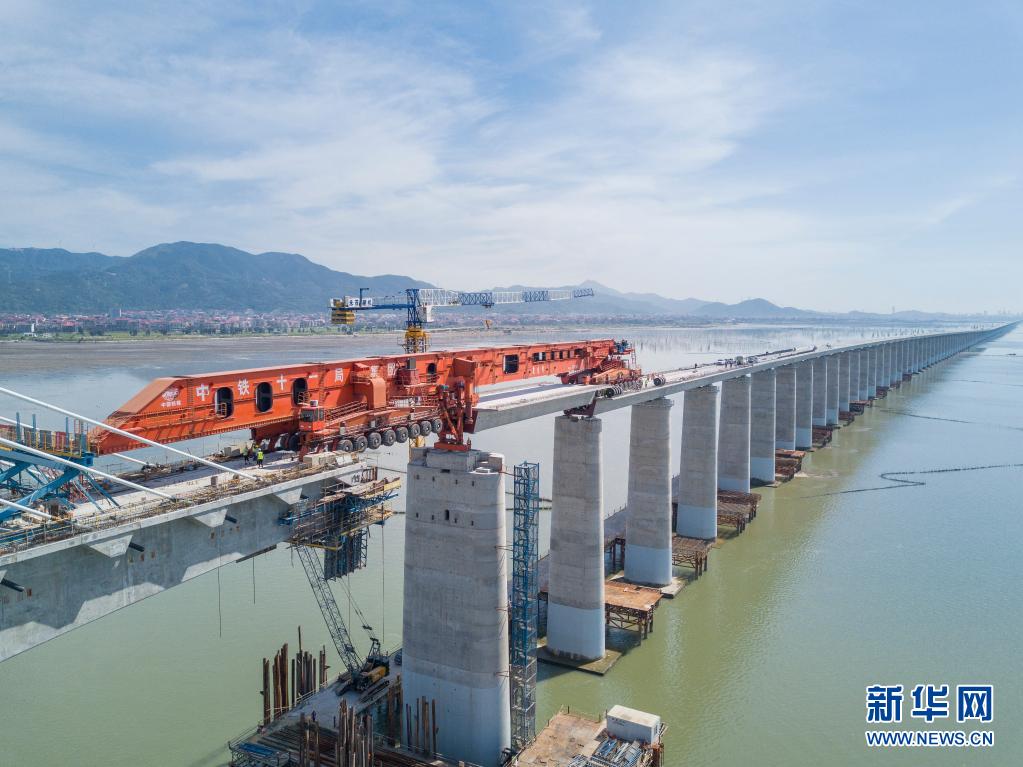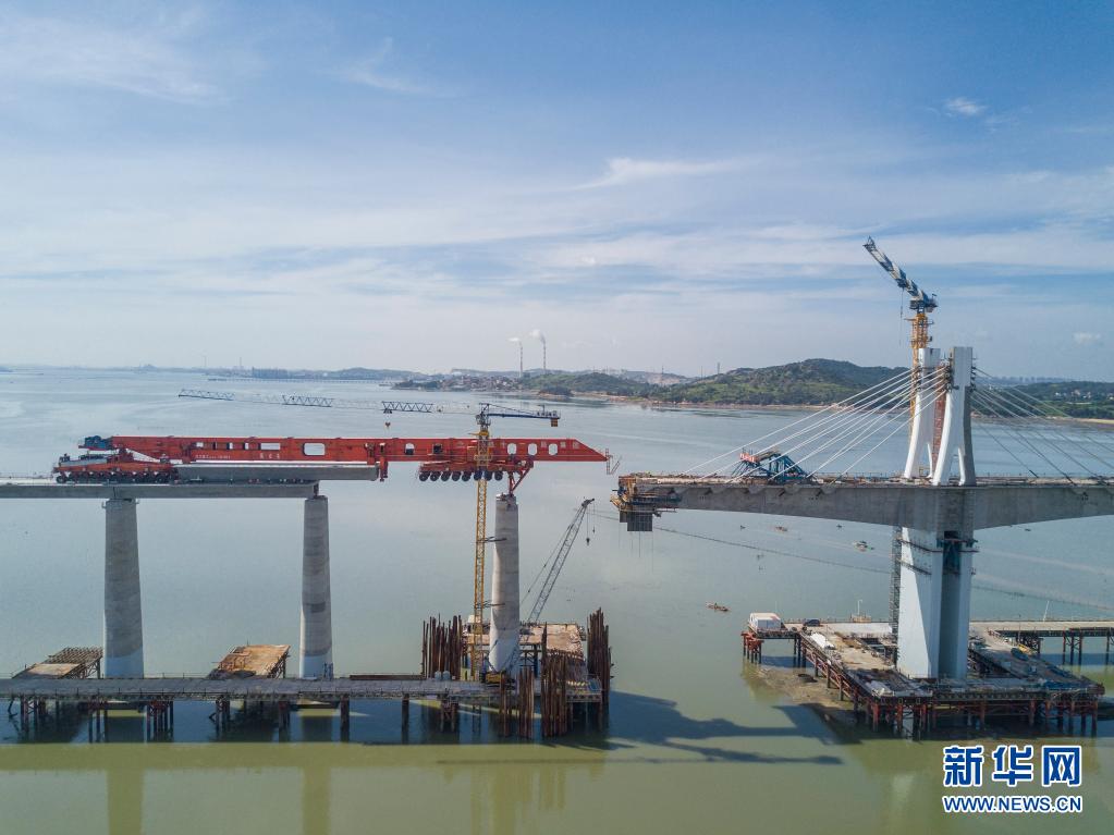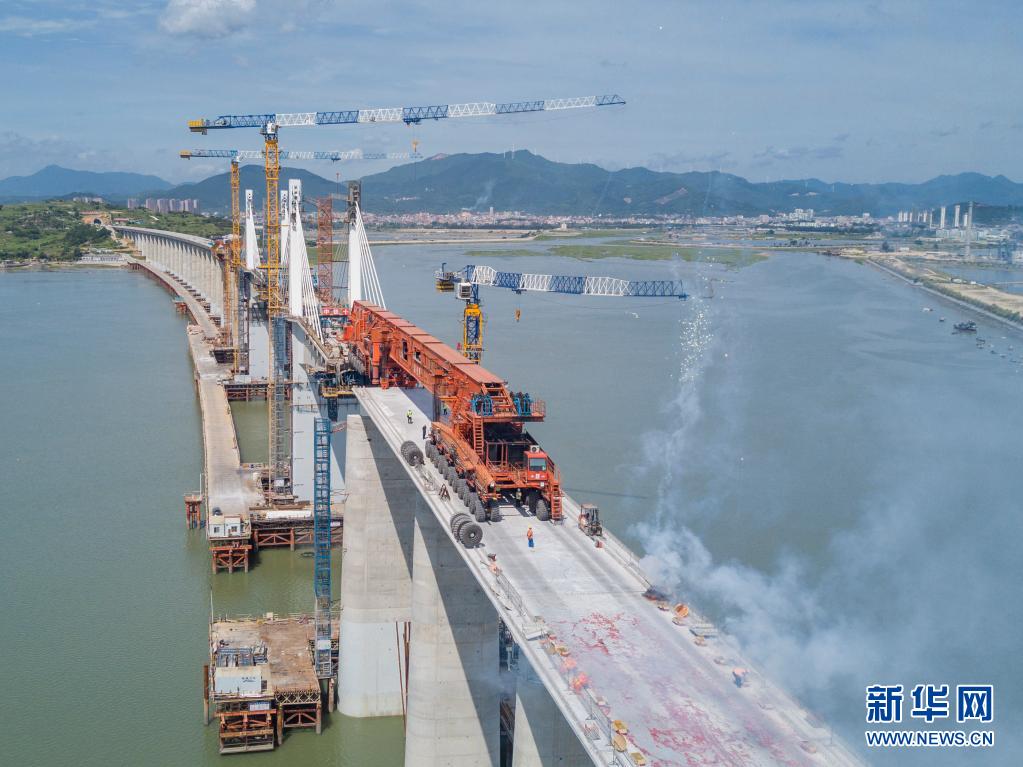 7月11日,在新建福厦铁路湄洲湾跨海大桥建设现场,中铁十一局工人协同“昆仑号”千吨级运架一体机架设该线路最后一孔40米箱梁。