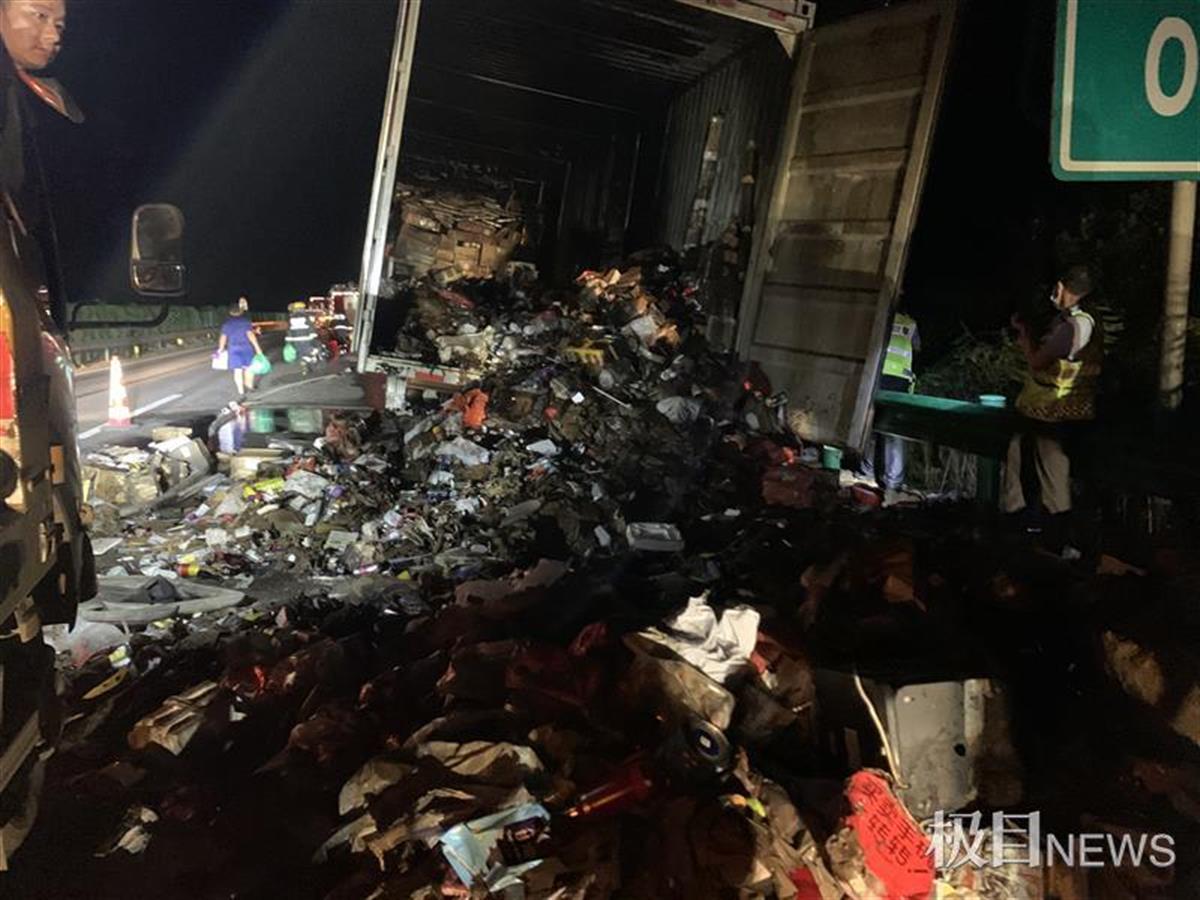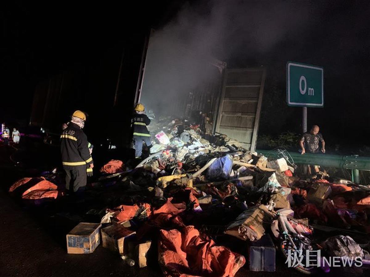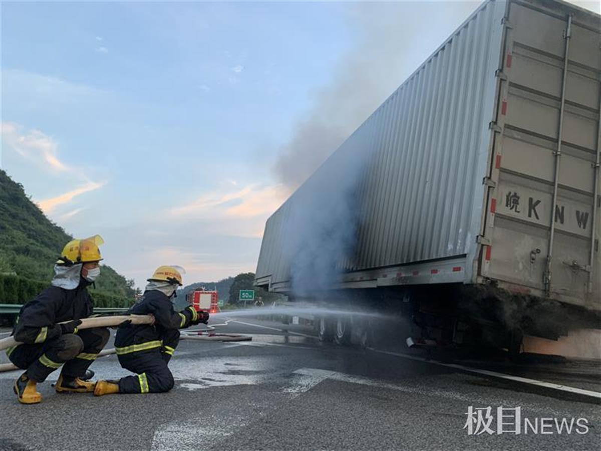 消防救援人员到达现场后,只见一辆车头、车身分离的半挂厢式货车正停在应急车道上,车辆部分轮胎已被燃烧殆尽,车厢内不时传出“砰砰”爆炸声。