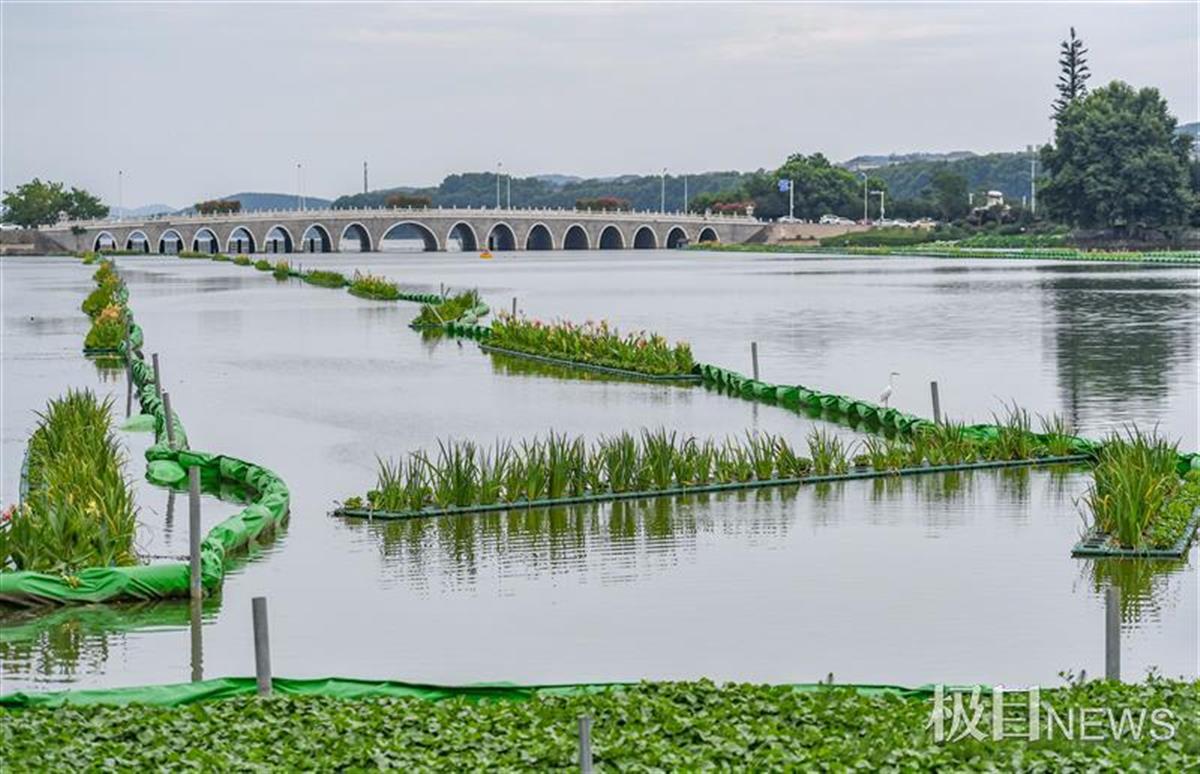 7月12日上午,极目新闻记者现场看到,水果湖波光粼粼,浅水处湖底绿植清晰可见,湖边和湖中浮床上种植的美人蕉、鸢尾,铜钱草等水生植物长势良好。