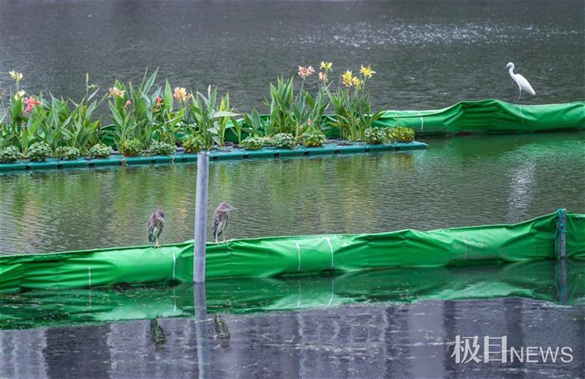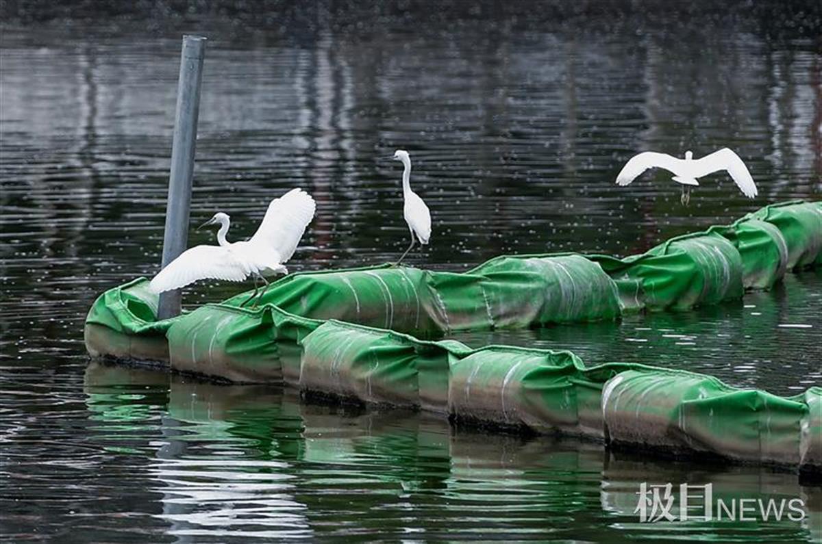 让记者颇为意外的是,湖面上到处是白鹭、夜鹭、须浮鸥、黑水鸡等水鸟。只见不少白鹭和夜鹭站在湖中的浮床等漂浮物上休憩,成群的须浮鸥则不时向水面俯冲捕捉小鱼。记者初略数了数,仅白鹭和须浮鸥,数量都各有数十只,相比以前偶有少量的水鸟出没,数量明显增多了不少。