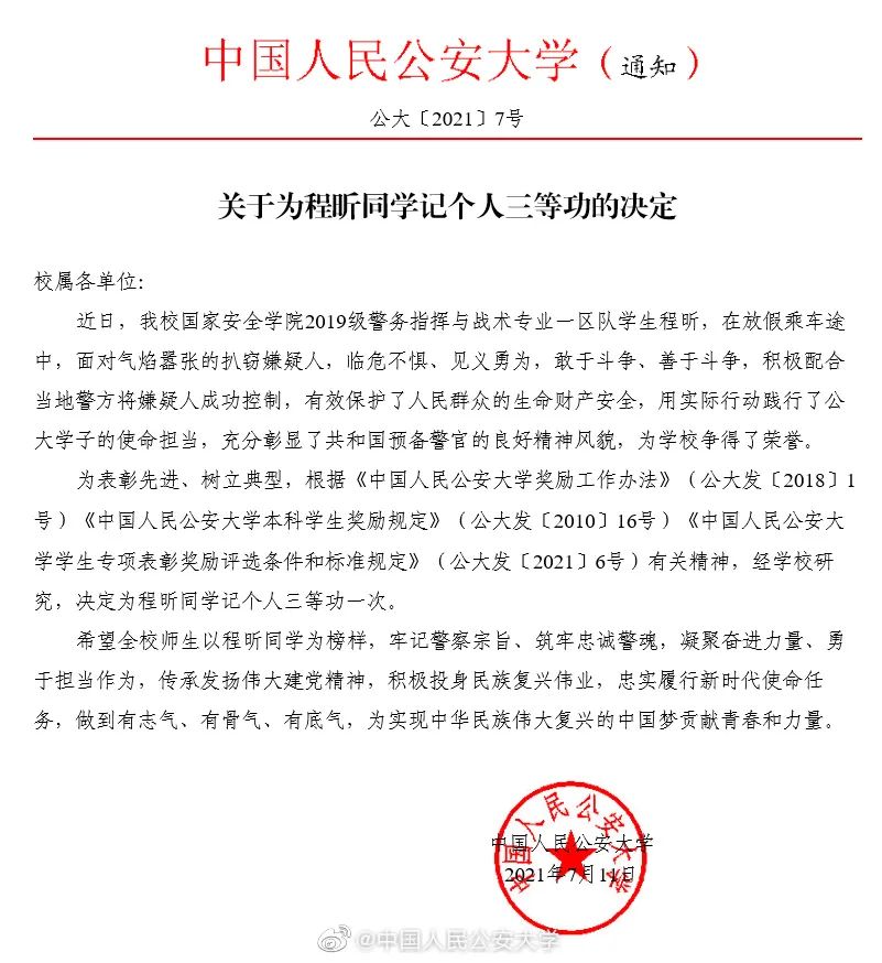 决定给予程昕同学记个人三等功!
