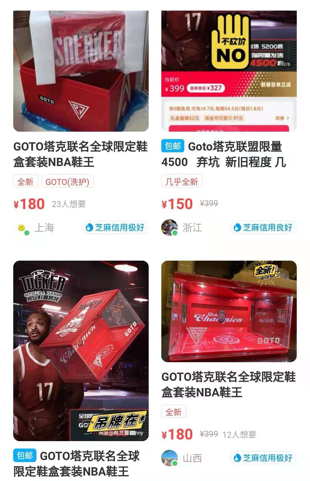 在闲鱼上,记者注意到,原价399元的GOTO塔克联名全球限定鞋盒套装NBA鞋王现已跌至180元。