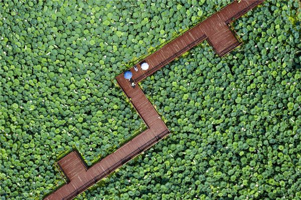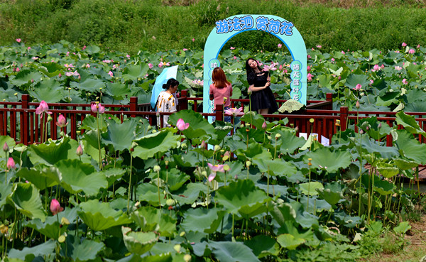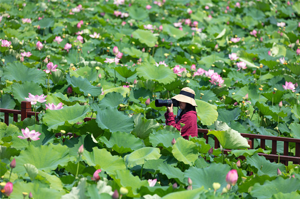 游客在荷塘游玩。 城市摄影队孙树海 摄