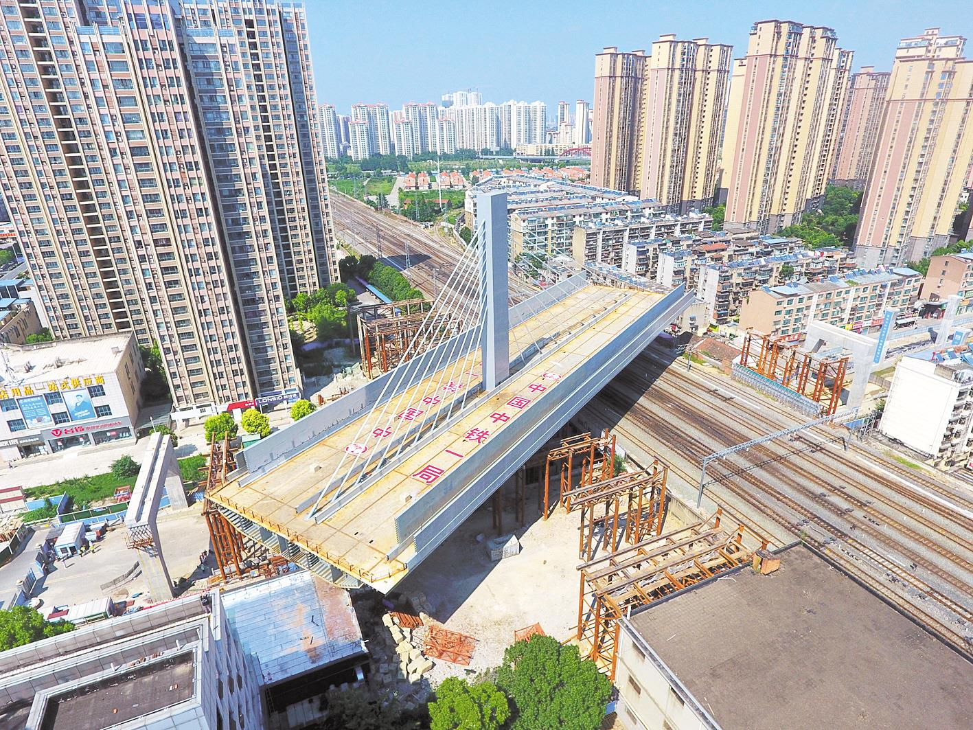 7月13日,襄阳东西轴线樊城段跨越焦柳铁路线的斜拉桥成功实现转体。该桥是襄阳主城区首座转体桥,桥梁为全钢结构,全长159米,宽27.5米,梁重4000吨,横跨焦柳铁路,采用“非对称全钢结构独塔单索面斜拉桥+盖梁中央转体施工”的工艺。整个桥梁转体利用铁路线的运营空窗点进行,转体持续时长约100分钟,顺时针旋转93.5°完成。目前,樊城段项目整体形象进度已完成85%,正在全力冲刺年底通车目标。