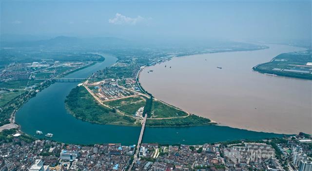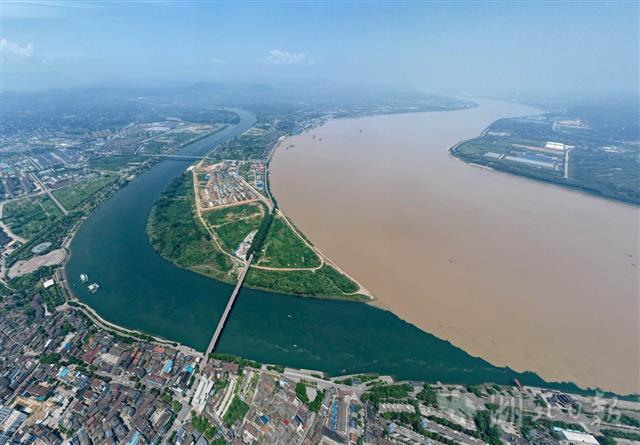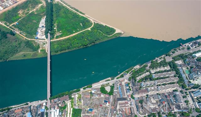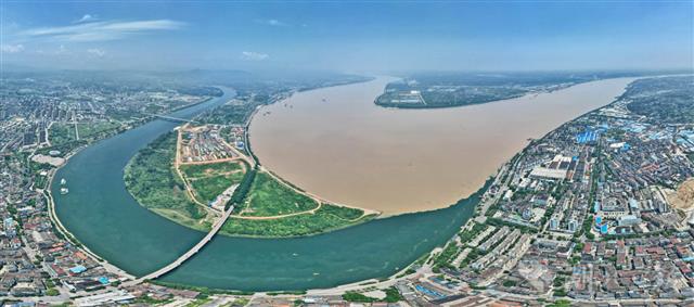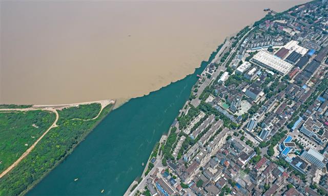 7月14日, 在长江湖北宜都段,长江与清江交汇处形成了泾渭分明的界限,蔚为壮观。随着长江汛期的来临,平常清澈的江水开始变得浑浊,长江与清江在宜都市陆城境内交汇,清浊两条江水在此合流,清浊分明的交界线引人注目,形成泾渭分明的奇特景观。清江是长江一级支流,全长423公里,流经宜都44公里,在宜都陆城汇入长江。(湖北日报全媒记者 刘曙松 通讯员 朱灿义 摄)