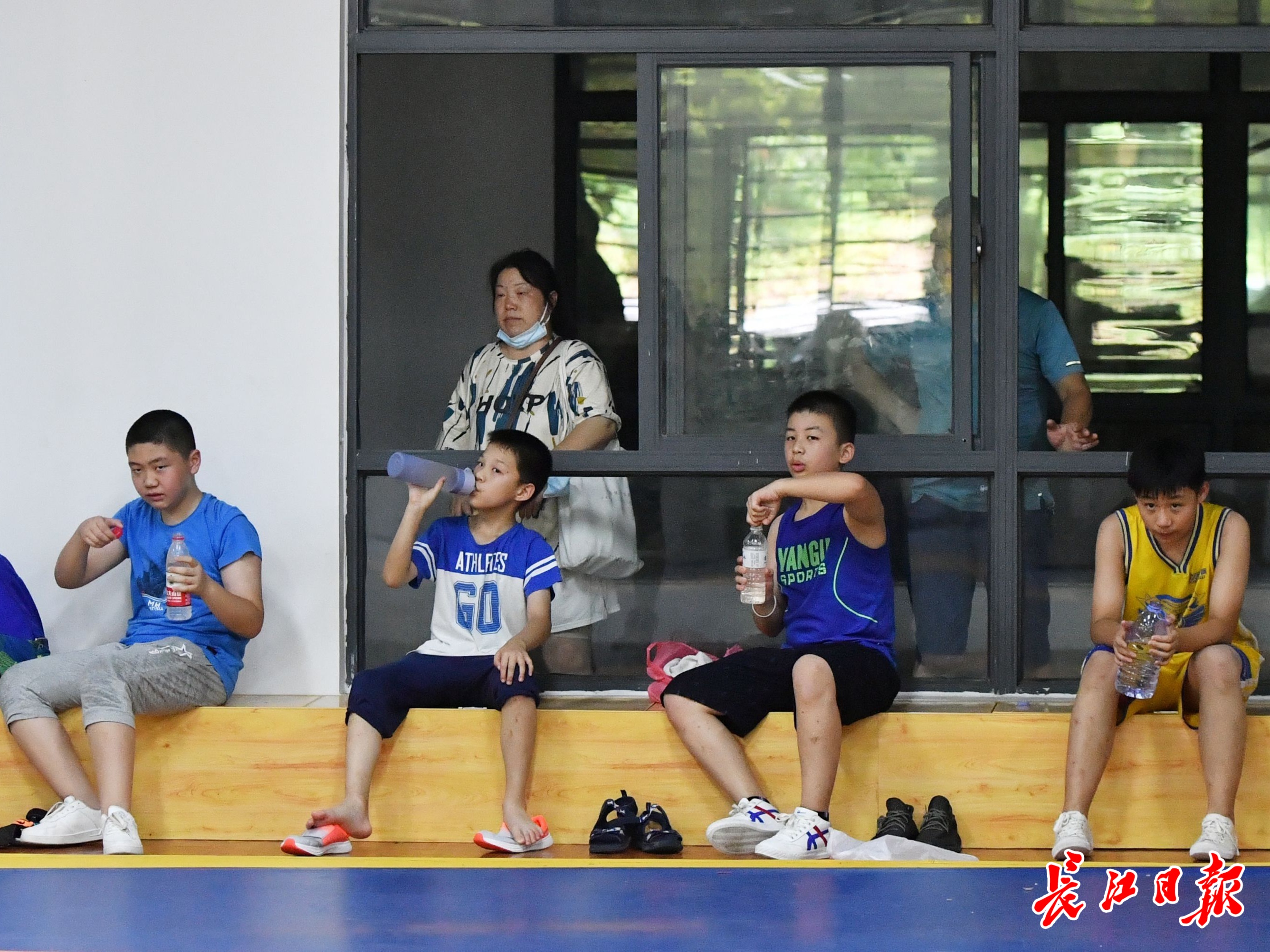 训练间隙孩子们在喝水休息。