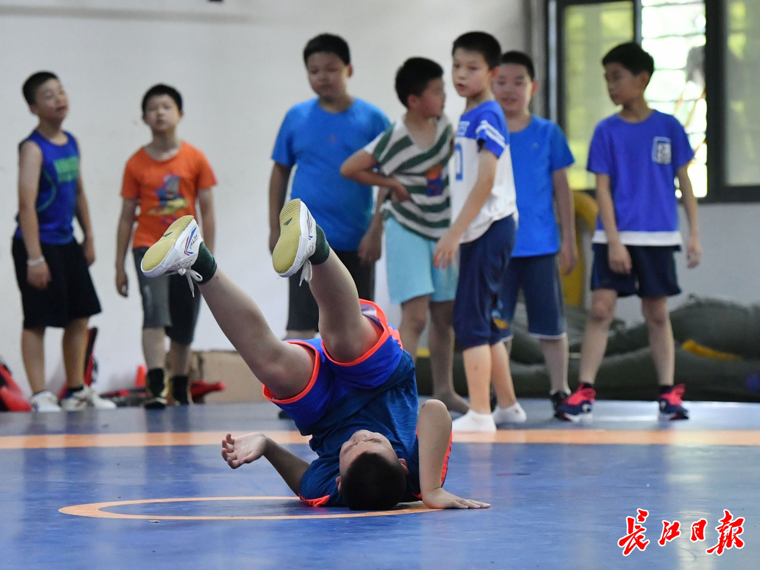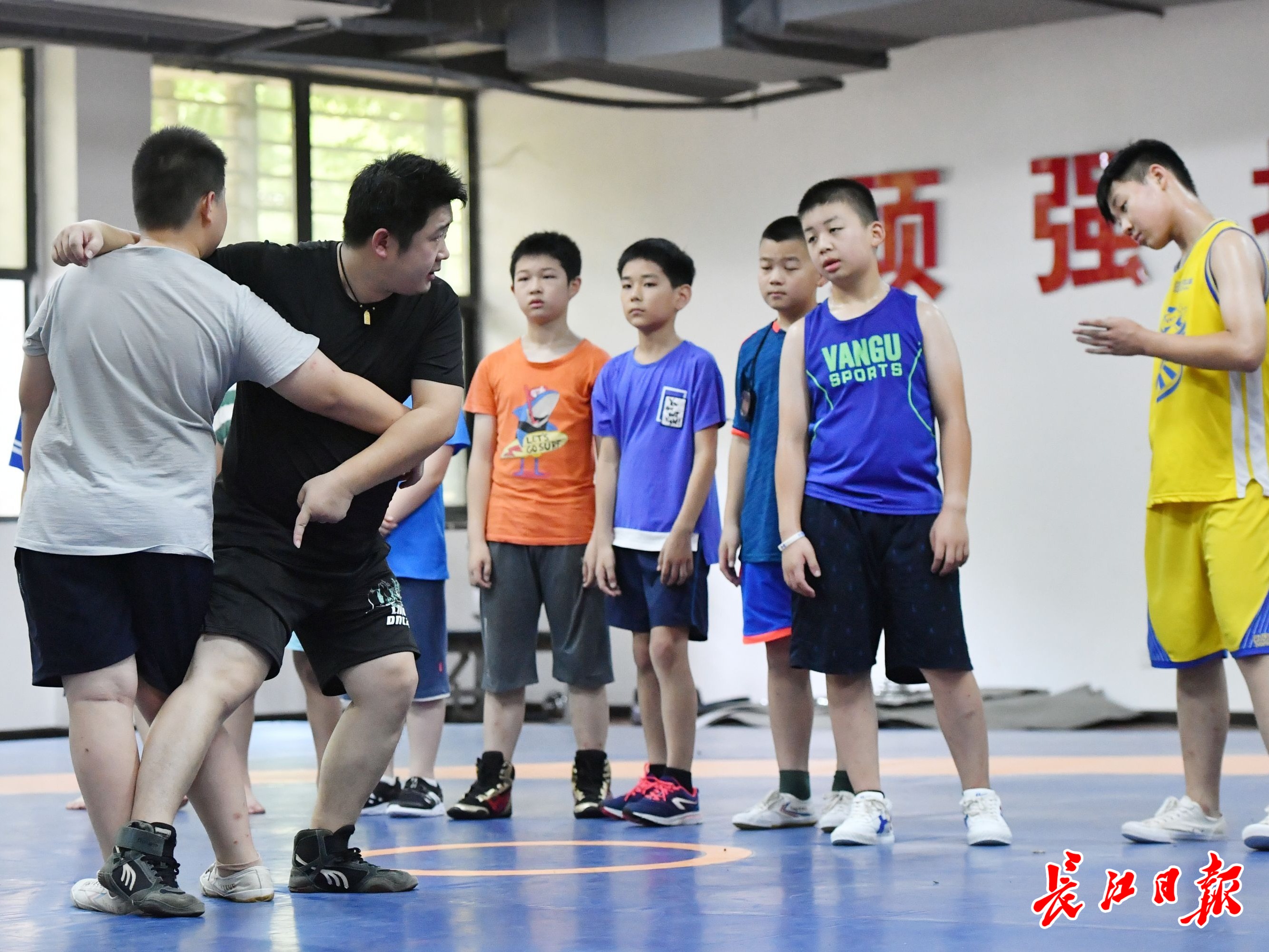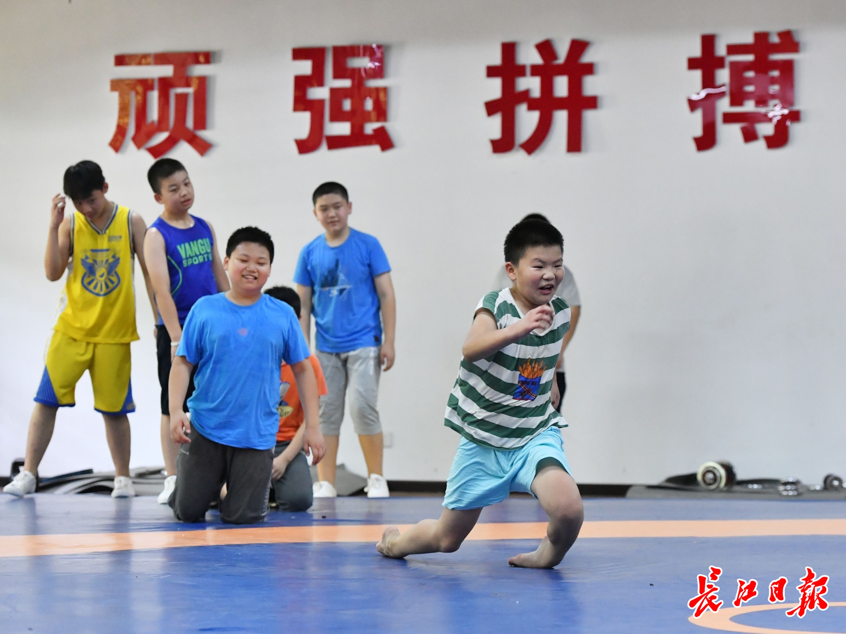 7月14日,在东西湖区全民健身中心,参加武汉市青少年体育夏令营摔跤项目免费培训的孩子们,在训练垫上挥洒汗水苦练基本功。今年,全市有16880名孩子在170个培训点参加16个体育技能项目培训,而学习摔跤的只有一个培训点的40个名额,这也是16个项目中,唯一一个直接肢体接触的竞技对抗项目。练习摔跤,能够提升人的力量、速度、耐力、柔韧性、灵敏度等综合素质。同时还可以锻炼人的意志品质,让孩子们得到全面发展。