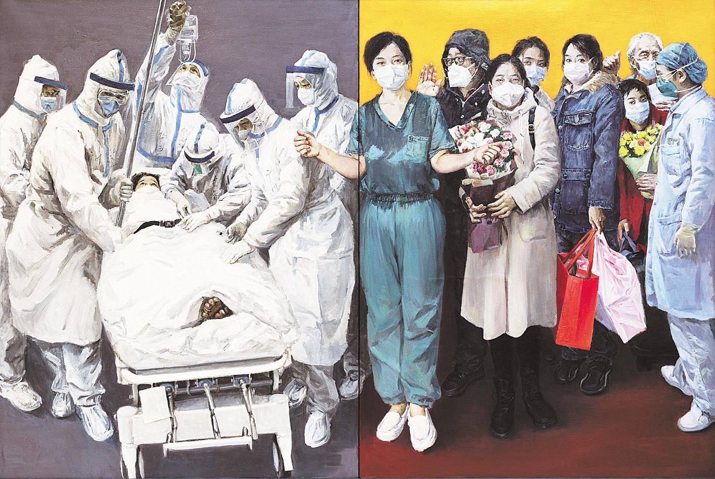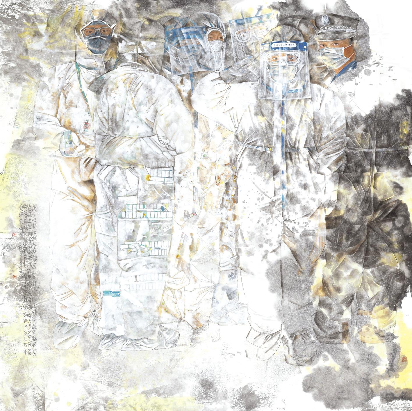 参展作品中,李静姝的《小红绳》,展现了下沉人员自创小红绳、小竹篮将物资安全送到独居老人手上,也送去了温暖;韦伶的《巾帼》,淡墨轻描间展现了赵一曼、杨开慧等巾帼英雄值得后人铭记的精神风韵;李思洁的《武汉共产主义小组》,以纯墨表现早期共运领袖的精神风貌;严好好的《星火燎原》,以赤色渲染凸显一个特殊时代;徐谦的《第一个红色县级政权》,还原一个农民运动风起云涌的时代;李洋的《外公的军功章》,借静物讴歌了一段烽火岁月;李达的《战场》,用繁复密闭的医疗现场,于无声处描绘抗疫紧张的战场……