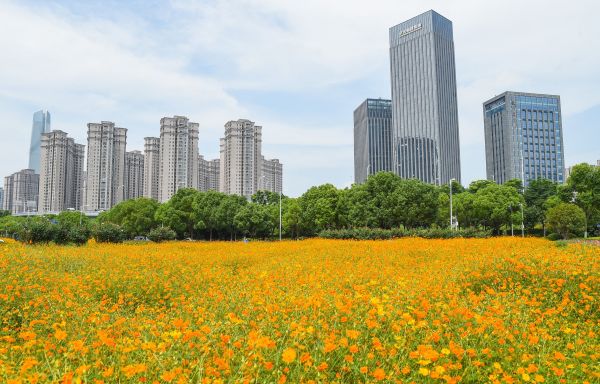 江汉区甚至在地处中心闹市的泛海城市广场前,整理出50000平方米的大片花田。眼下,花田正处盛花期,黄的硫华菊明艳、紫的波斯菊温婉、五彩混播的百日草热闹,高楼环抱着诗意野趣,装点得武汉的夏天格外灿烂。