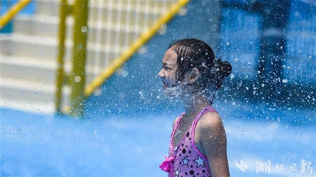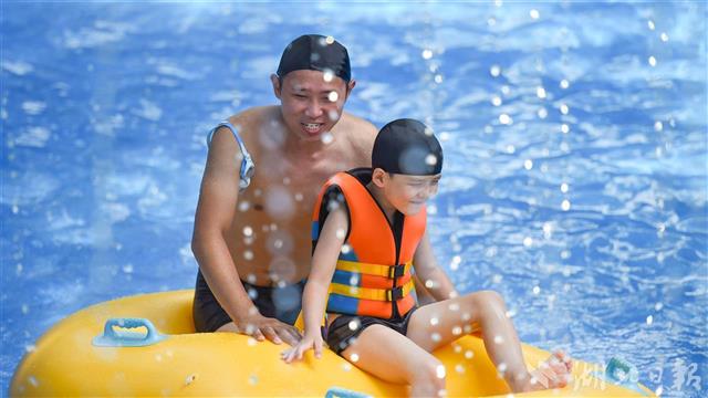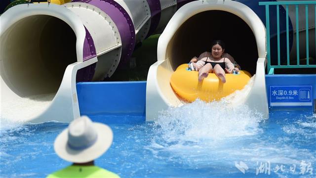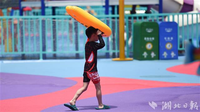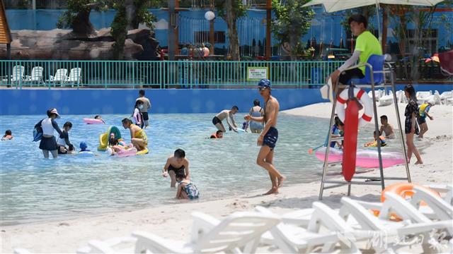当日,在武汉市青少年宫水上世界,众多市民前来戏水游泳享受清凉。