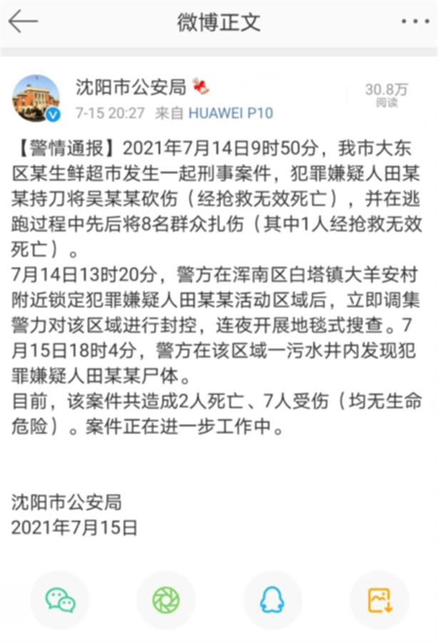 7月15日晚上,沈阳市公安局官方微博发布信息,当晚6时4分许,警方在在浑南区白塔镇大羊安村一污水井内,发现犯罪嫌疑人田长录尸体。目前,该案件共造成2人死亡、7人受伤(均无生命危险),案件正在进一步处理中(极目新闻连续报道)。