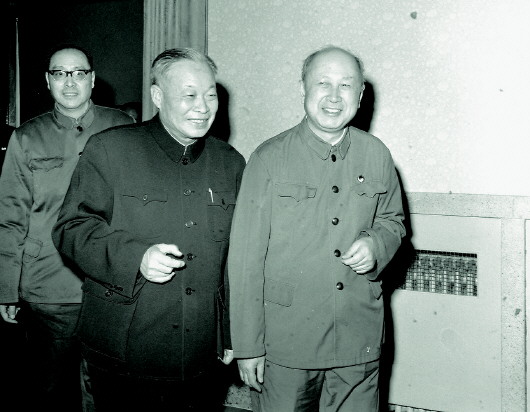 钱三强(中)和钱学森(右)在1978年全国科学大会上。新华社资料片