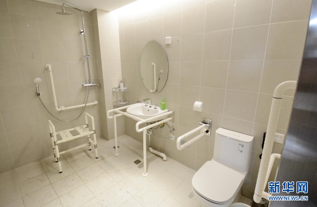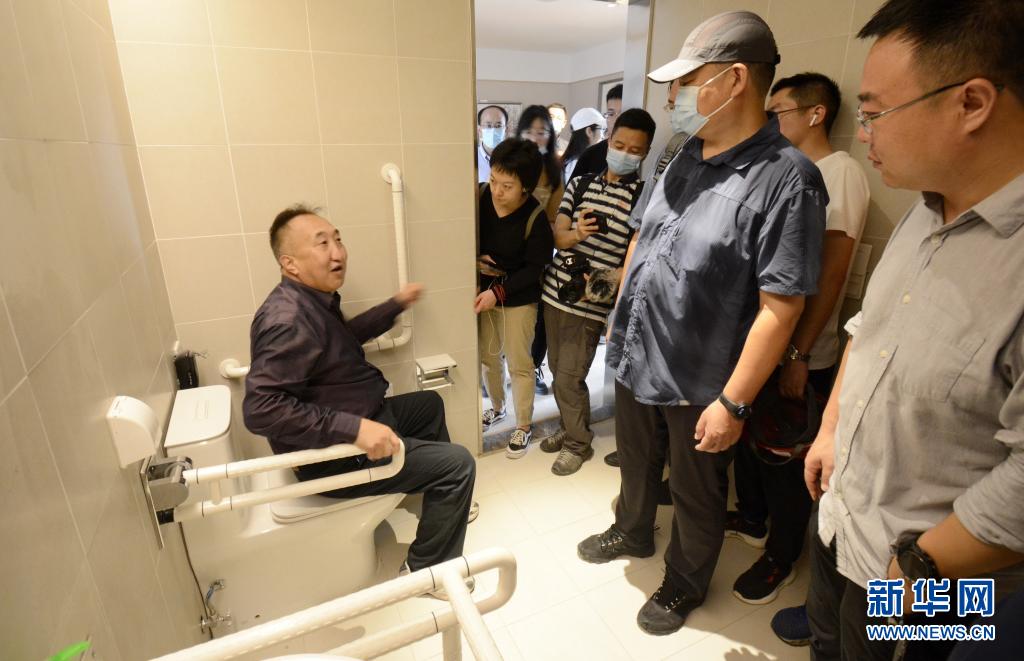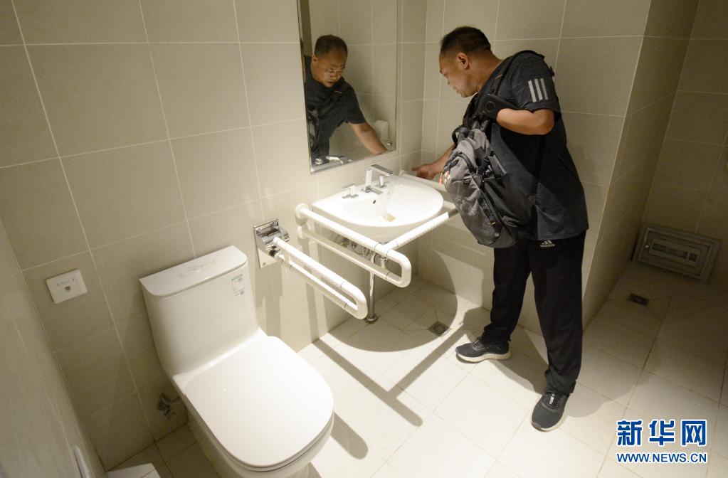 7月15日,无障碍专家在北京延庆赛区冬奥村检查室内卫生间无障碍设施。