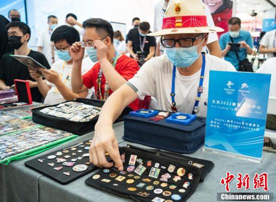 7月17日上午,“北京2022徽章交换中心”在北京王府井工美大厦正式启用,这是“北京2022奥林匹克徽章文化周”的活动环节之一,奥运徽章爱好者可在此互通有无,交流奥运徽章收藏心得。图为一名奥运徽章收藏者整理自己用于交换的徽章。 中新社记者 侯宇 摄