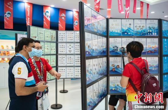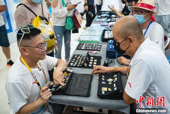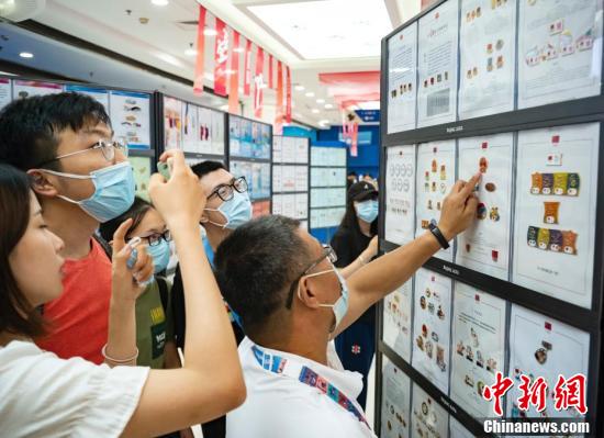 7月17日上午,“北京2022徽章交换中心”在北京王府井工美大厦正式启用,这是“北京2022奥林匹克徽章文化周”的活动环节之一,奥运徽章爱好者可在此互通有无,交流奥运徽章收藏心得。图为奥运徽章收藏同好之间在商讨交换事宜。 中新社记者 侯宇 摄