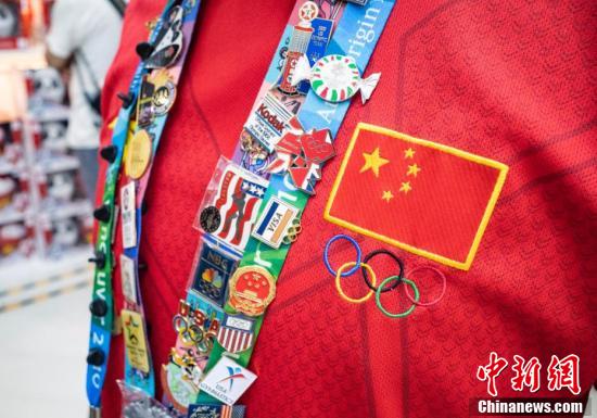 7月17日上午,“北京2022徽章交换中心”在北京王府井工美大厦正式启用,这是“北京2022奥林匹克徽章文化周”的活动环节之一,奥运徽章爱好者可在此互通有无,交流奥运徽章收藏心得。图为一名佩戴多枚奥运徽章的收藏爱好者。 中新社记者 侯宇 摄