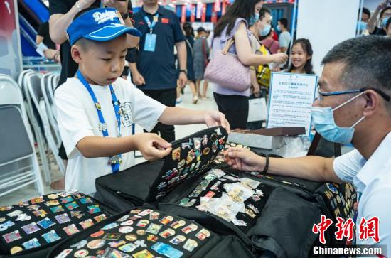 7月17日上午,“北京2022徽章交换中心”在北京王府井工美大厦正式启用,这是“北京2022奥林匹克徽章文化周”的活动环节之一,奥运徽章爱好者可在此互通有无,交流奥运徽章收藏心得。图为9岁半的张博钦(左)与奥运徽章收藏同好商讨交换事宜。 中新社记者 侯宇 摄