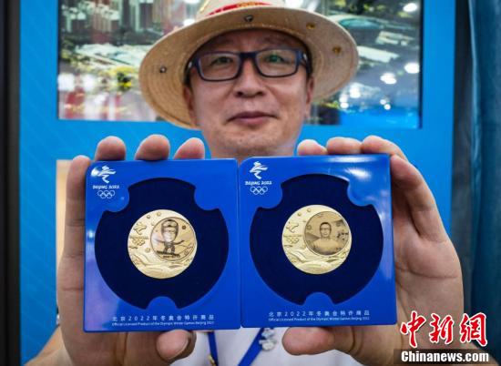 7月17日上午,奥林匹克历史上第一台个性化徽章制作机亮相北京王府井工美大厦,使用者经过简单操作即可将个人形象镭射到北京2022冬奥会主题的徽章上。当天,“北京2022奥林匹克徽章文化周”的活动环节之一的“北京2022徽章交换中心”在此启用,“冰与火的澎湃·奥林匹克徽章展”也同期开幕。图为一名收藏者展示以自己头像定制的北京冬奥会徽章。 中新社记者 侯宇 摄