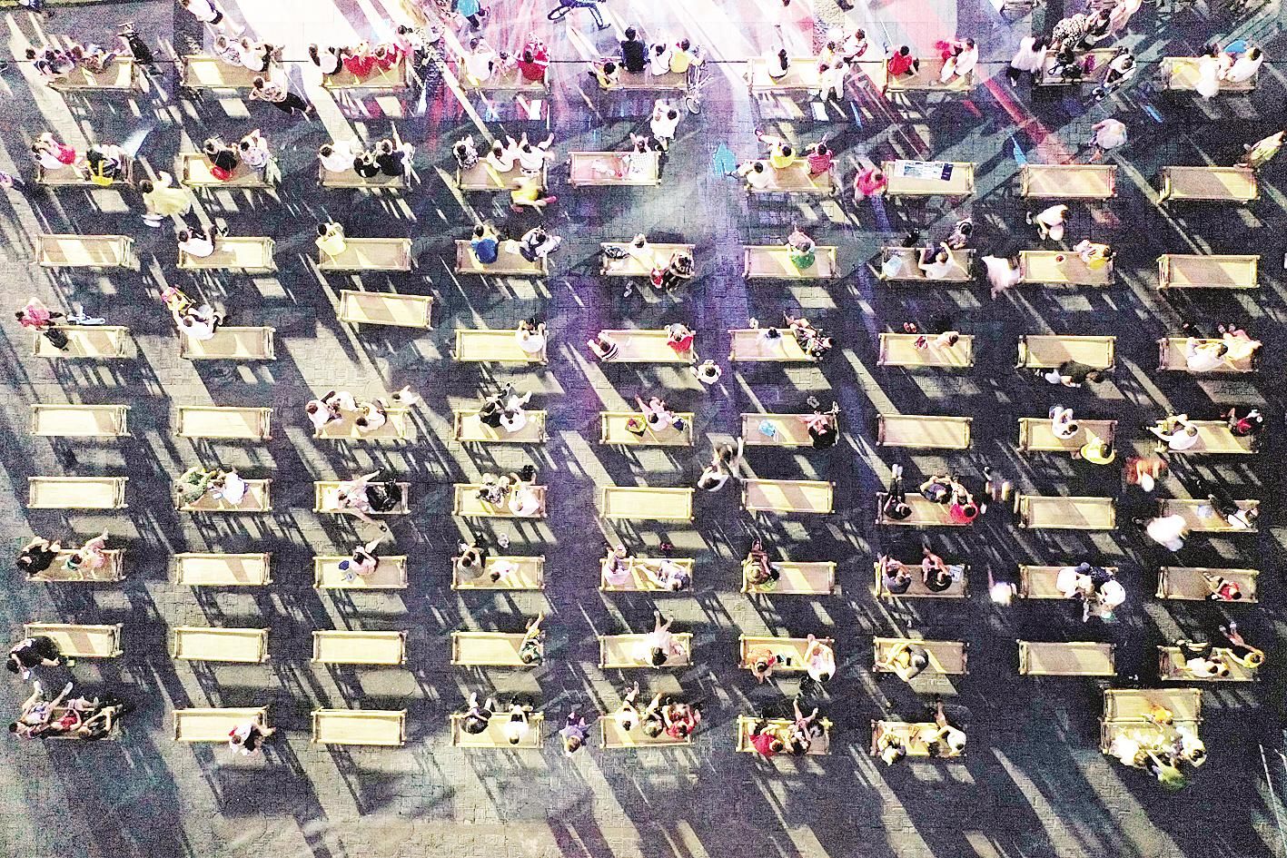 7月16日晚,武汉园博园汉口里竹床文化节开幕,游客席床而坐,摇着蒲扇,欣赏文艺演出,品尝消夜美食,百余张竹床重现武汉夏夜纳凉习俗。