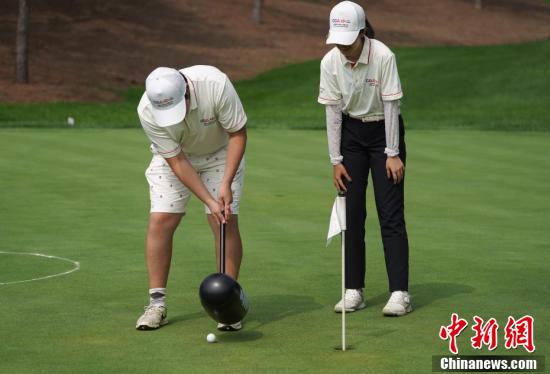 7月19日,2021汇丰青少年高尔夫亲子挑战赛-晋级赛在北京通盈?雁栖湖高尔夫俱乐部举行。图为张中皓(左)、张铭语兄妹比赛趣味洞使用气锤推杆。 中新社记者 崔楠 摄