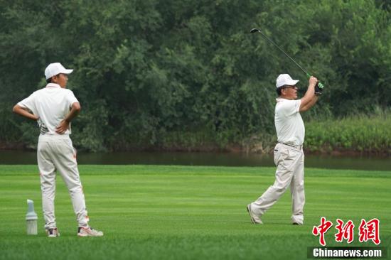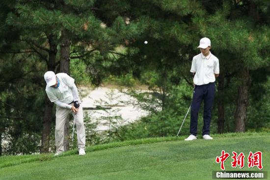 7月19日,2021汇丰青少年高尔夫亲子挑战赛-晋级赛在北京通盈?雁栖湖高尔夫俱乐部举行。图为刚占库(右)、刚嘉辰父子在比赛中。 中新社记者 崔楠 摄
