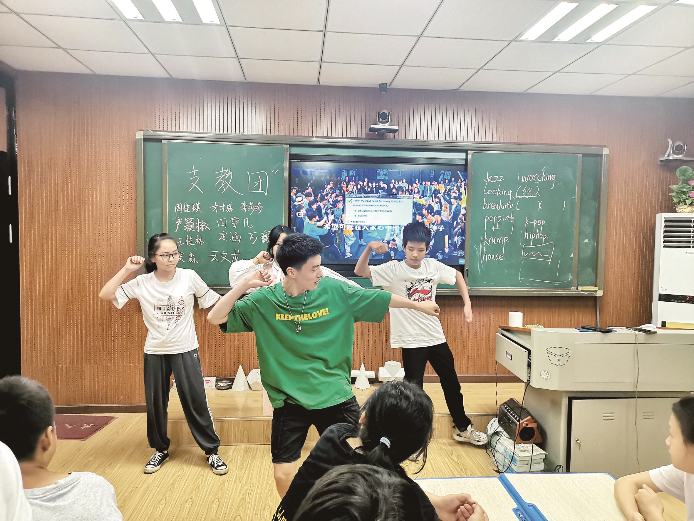 这些老师是武汉纺织大学数理科学学院的12名师生,在持续10天的支教活动中,他们每天上午为学生上课,下午走访学生家庭,晚上就在教室里打地铺。“来之前我们就知道条件艰苦,但大家都没有退缩,每人都背来了铺盖卷儿。”带队老师、武汉纺织大学教师熊亚雄说,6月在筹备暑期实践活动时,他们得知胡林中学有许多留守学生,有暑期陪伴学习的需要,便筹备课程,申请来校支教。