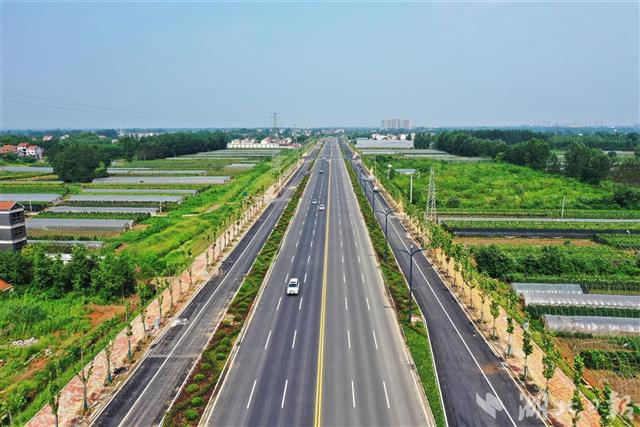 2021年7月20日,在武汉市新洲阳大公路周孟路口,宽60米、双向10车道的新阳大公路宽敞平坦、标线清晰,行人和车辆各行其道。当日,全长17公里的武汉市新洲阳逻至大埠公路经过中国一冶等施工单位的拓宽改造后通车。