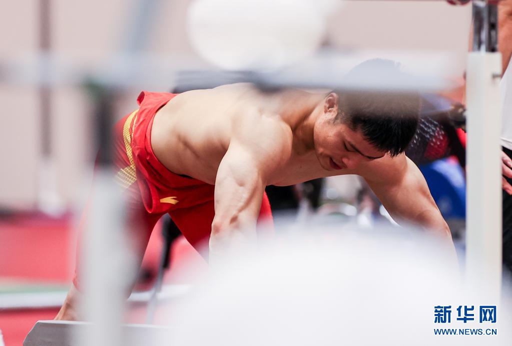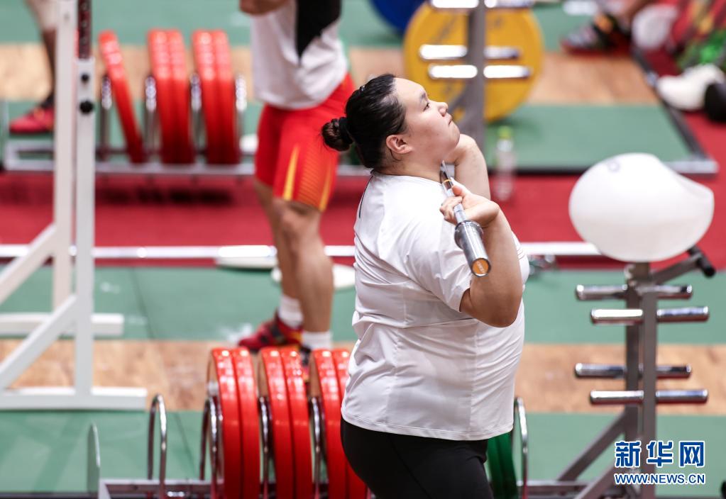 当日,中国举重队前往东京国际论坛大厦进行首次热身训练。