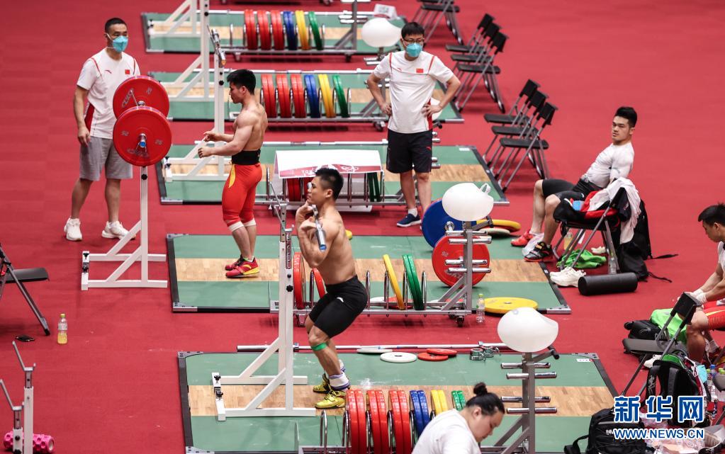 7月20日,中国举重队在东京国际论坛大厦热身训练。
