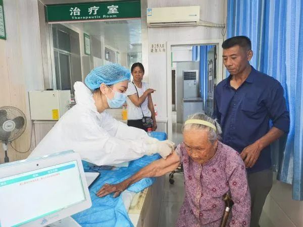 荆州区李埠镇卫生院工作人员在尊重老人及其家属的意愿的情况下,对刘文秀老人进行了预检,老人血压高压120,低压88。符合身体健康、无禁忌症的基础,顺利接种了第一针新冠疫苗。