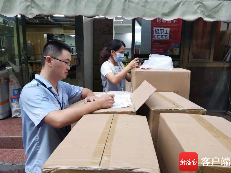 新海南客户端、南海网、南国都市报7月20日消息(记者蒙健 摄影报道)7月19日下午,海口市市场监管局龙华分局金贸监管所根据摸底排查工作中,对龙华区国贸路的“好有爱”外卖餐饮店进行检查时,查获不可降解塑料制品共57箱4万余个。目前,执法人员已对此批塑料制品进行扣押并立案调查。