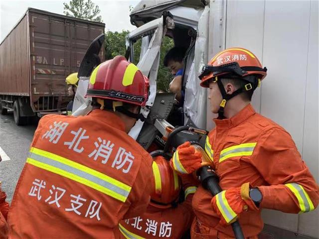 湖北日报讯(记者王成龙、通讯员汉消)7月19日,武汉市洪山区三环线上发生一起交通事故,两辆货车追尾,造成后车驾驶员被困。接到报警后,洪山区消防救援大队南湖消防救援站迅速赶往现场救援。