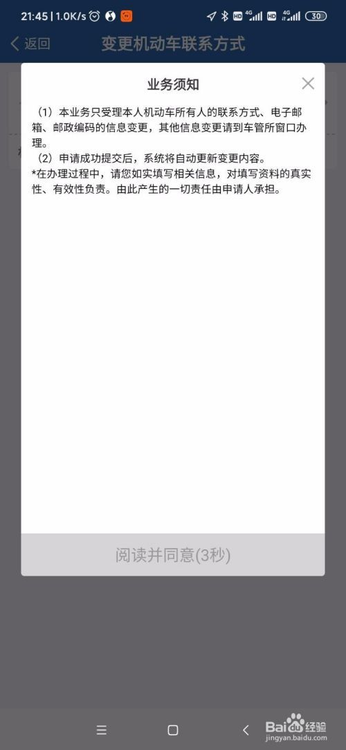 3、在“变更机动车联系方式”界面点击查询,查看阅读须知内容,等待倒计时完成。