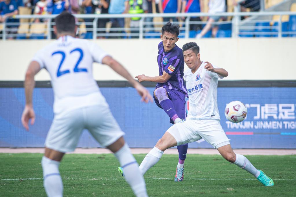 7月22日,天津津门虎队球员苏缘杰(中)在比赛中射门。