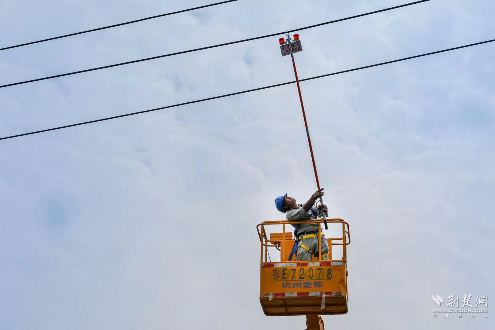 供电公司工作人员正在装设电力线路防碰挂警示灯。通讯员供图