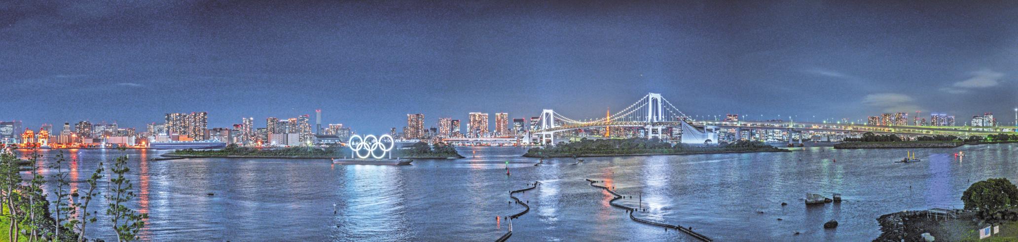 7月21日傍晚拍摄的位于东京湾的奥运五环标志。 (新华社发)