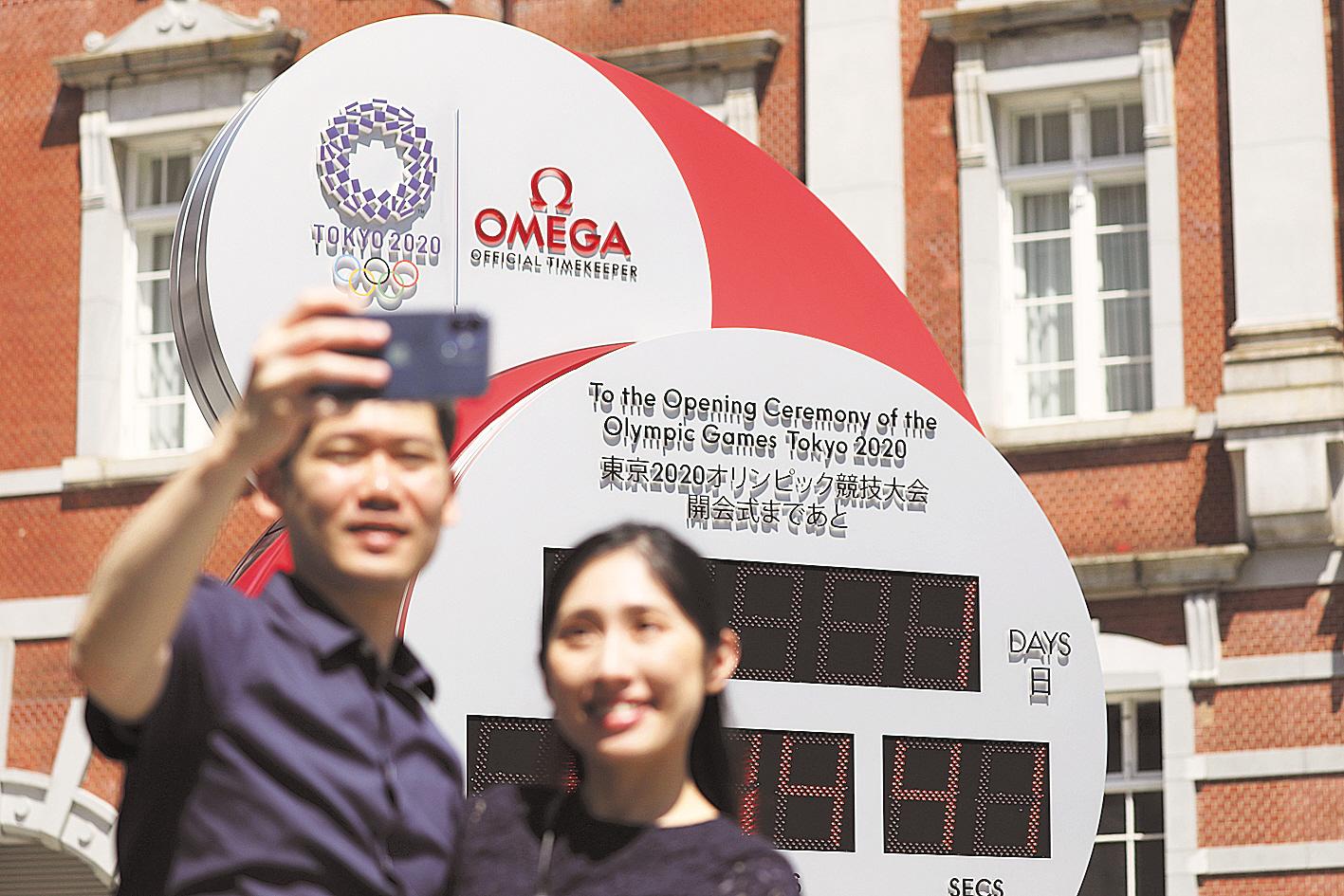 人们在东京车站前的广场上与东京奥运会倒计时电子时钟合影。(新华社发)