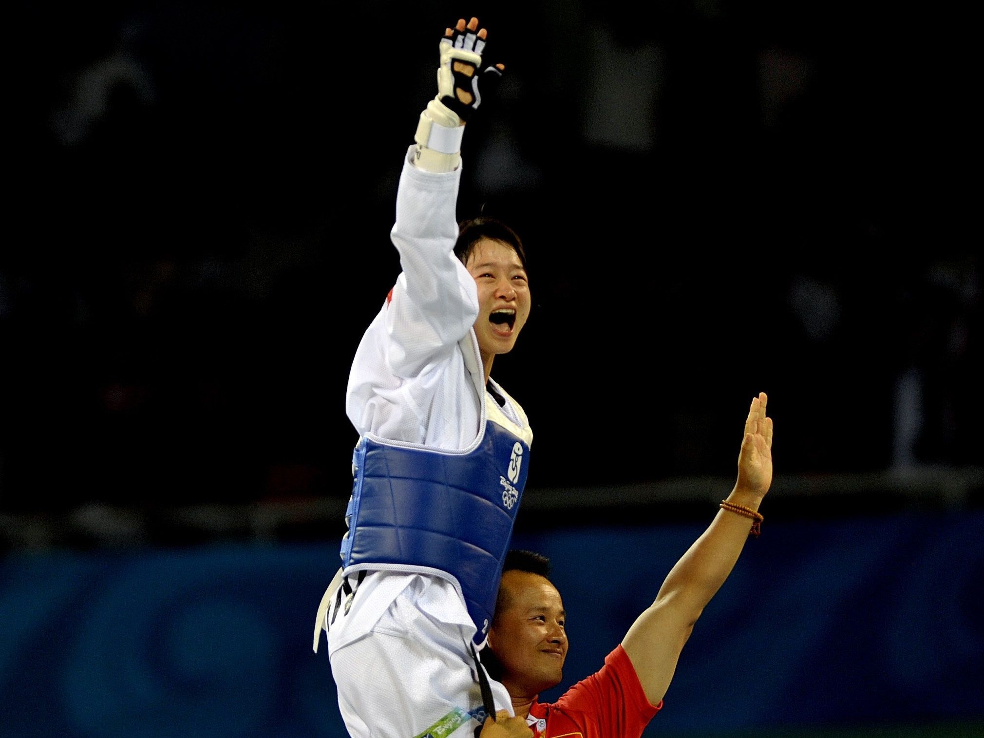 在北京奥运会跆拳道女子49公斤级决赛后,中国选手吴静钰(上)与教练庆祝夺冠(2008年8月20日摄)。新华社提供