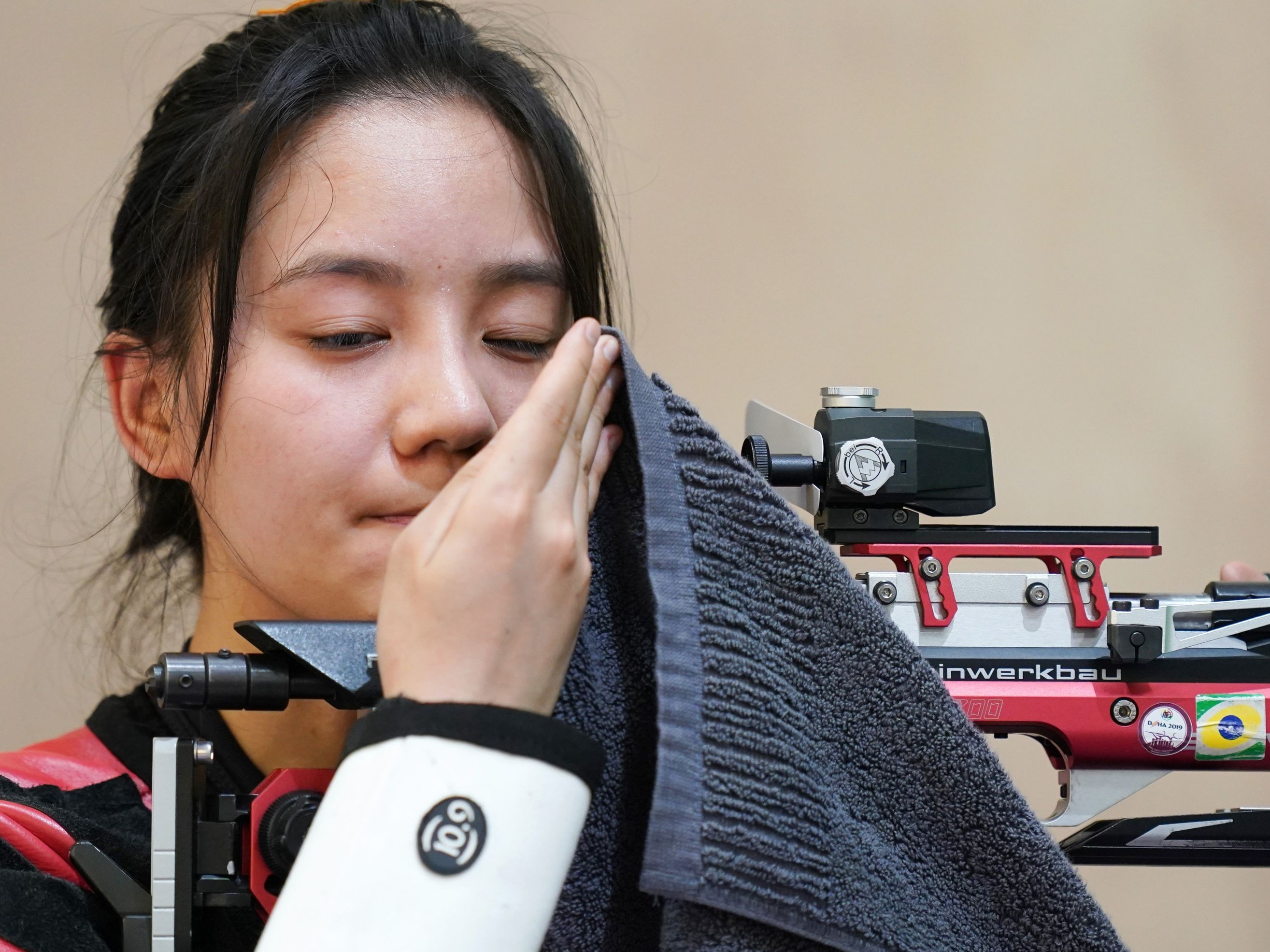 7月20日,中国射击队队员王璐瑶在训练中擦拭汗水。新华社提供