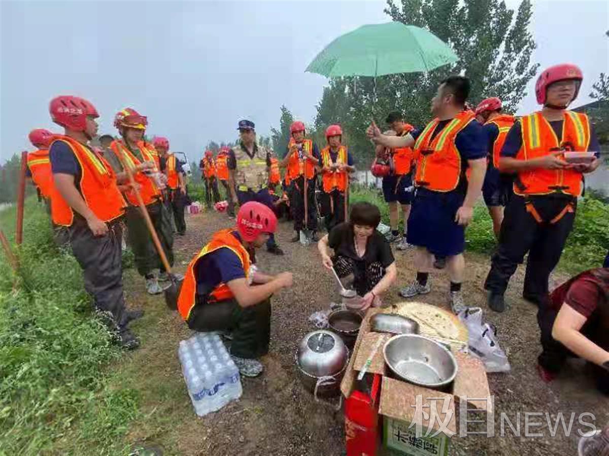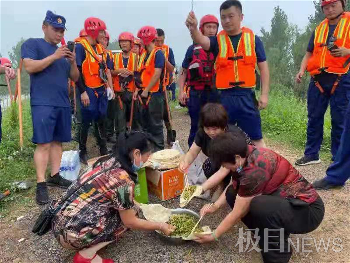 令消防指战员感动的是,就在他们对溃堤决口进行封堵作业时,三位河南热心大姐用两三个小时自做百余张烙馍和炒菜、八宝粥等食物,来到大堤上慰问消防指战员。河南大姐动情的说:“你们大老远来河南抢险救援,我在家做梦都想给消防子弟们卷个馍吃吃,就想让你们吃上热乎饭、热乎菜”。