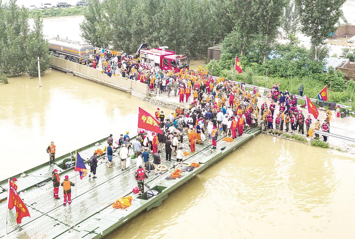 赵俊磊说:“以一号船为例,10%的老人和病号还有弱小的孩子,靠救援人员蹚齐腰深的水抬着走、背着走或者抱着走,转移到舟桥上,然后送到岸上。”
